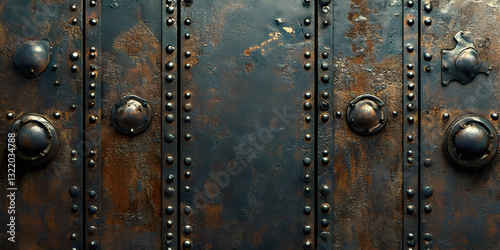 Fototapeta premium Close-up of an aged metal door with rusted rivets and an industrial texture. Ideal for steampunk designs, backgrounds, and architectural themes. Perfect for vintage, grunge, and retro aesthetics.