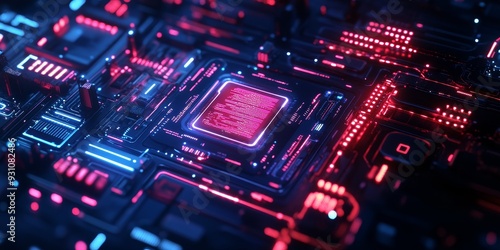 Fototapeta premium Close-up of an AI interface with neon-lit holograms, intricate circuit patterns, and a dark, futuristic backdrop