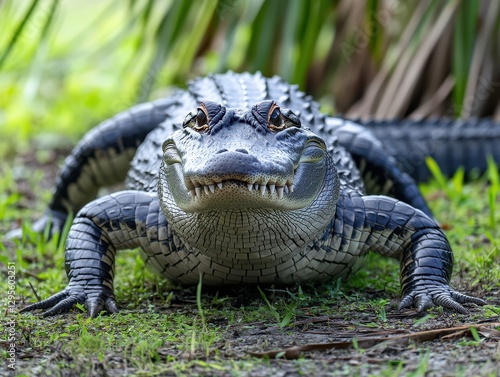 Fototapeta premium Close-Up of an Alligator Lying on Grass Surrounded by Lush Greenery,...