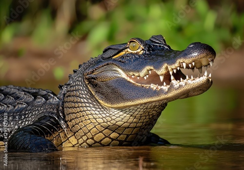 © ANUAR, Fototapeta premium Close-up of an Alligator with Sharp Teeth Emerging from Water in a Lush Green Environment Under Bright Sunlight in a Wild Habitat