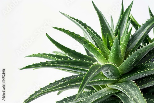 © juliars, Fototapeta premium Close up of an aloe vera plant, showcasing its vibrant green leaves and spiky edges against a clean white backdrop