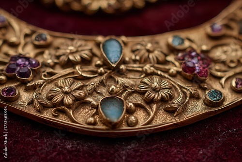 Obraz premium Close-up of an antique gold necklace with intricate floral engravings and delicate gemstone inlays, displayed on a velvet background