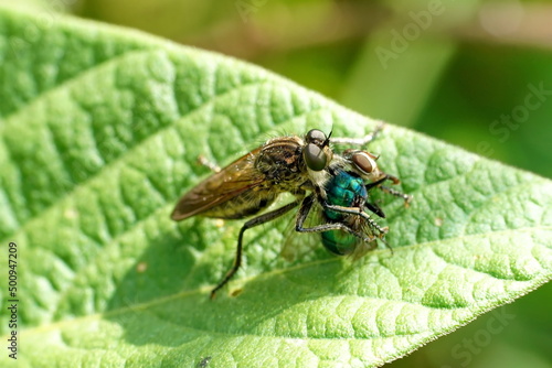 Fototapeta premium Close up of an assassin bug eating a blowfly in Cotacachi, Ecuador