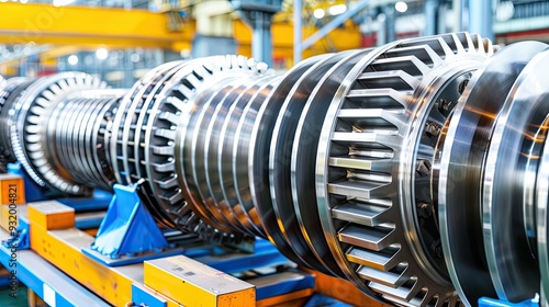 © Login, Obraz premium Close-up of an automobile gearbox with steel gears on the transmission shaft. The gears are all different sizes and are connected to each other. Gearbox. Illustration for brochure, advertising, etc.
