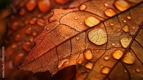 Obraz premium Close-up of an autumn leaf with water droplets highlighting its veins.