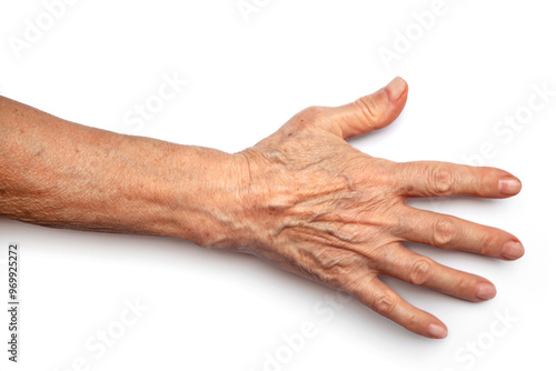 © Валентина Хруслова, Fototapeta premium Close-up of an elderly den woman's hand on a white background.