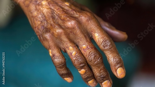 Fototapeta premium Close-up of an elderly hand showcasing unique textures and skin blemishes,...