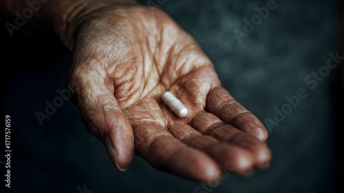 © Thares2020, Fototapeta premium Close up of an elderly person s wrinkled hand holding a single white capsule symbolizing healthcare and the aging process