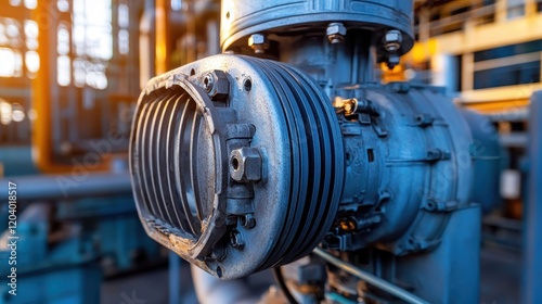 Fototapeta premium Close-up of an electric motor in operation, highlighting secure electrical connections and metal design in petrochemical setting.