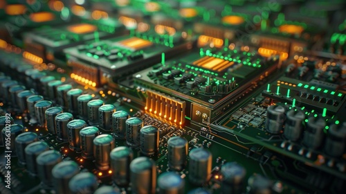 © Ahmad-Muslimin, Obraz premium Close-up of an illuminated circuit board with capacitors and glowing components.