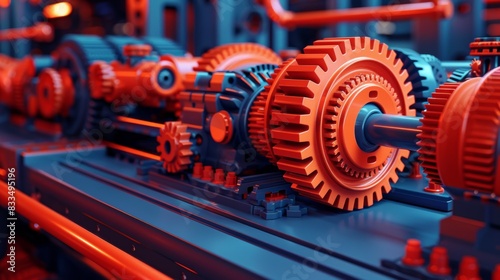 Fototapeta premium Close-up of an industrial machine's gears, showing the intricate workings and the precision of engineering, with a vibrant orange and blue color scheme highlighting the machine's complexity.