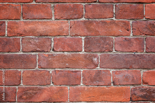 Obraz premium Close-up of an old and aged red brick wall texture background with vignetting.