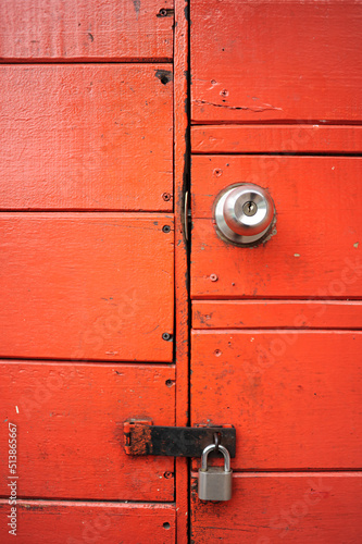 © BROTEstudio, Fototapeta premium Close-up of an old red wooden door with a gray metal padlock.