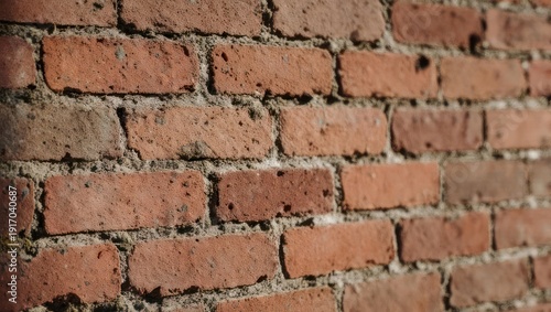 Obraz premium Close-up of an old weathered red brick wall with visible mortar joints.