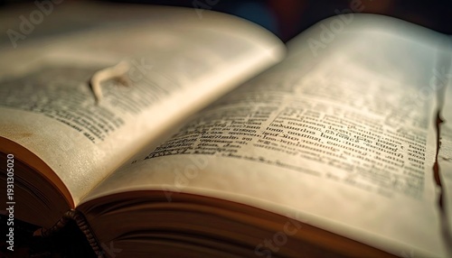 © Jupri, Fototapeta premium Close-up of an open, aged book with warm lighting illuminating the pages