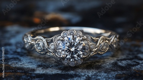 Obraz premium Close up of an ornate diamond engagement ring with a detailed band setting