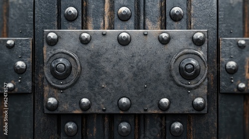 © Ruqqq, Fototapeta premium Close-up of an ornate metal door with rivets.