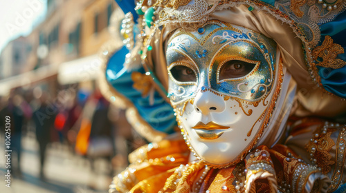 © khonkangrua, Fototapeta premium Close-up of an ornate Venetian carnival mask adorned with intricate designs and vibrant colors, captured in daylight.
