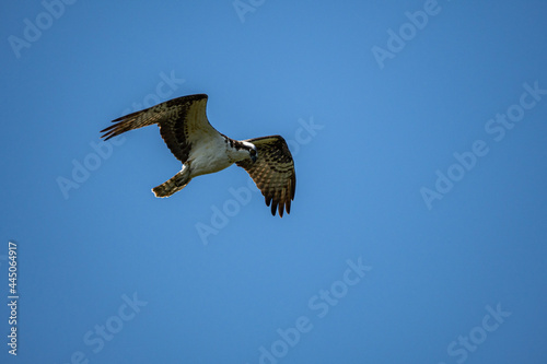 Fototapeta premium close up of an osprey looking down on the clear blue sky searching for its...
