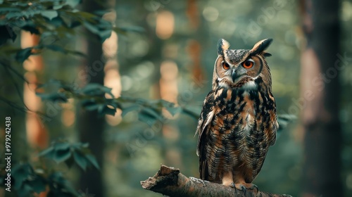 © Lakkhana, Obraz premium Close-up of an owl perched on a branch in a forest