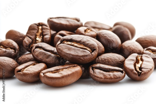 © Viam, Naklejka premium Close-up of aromatic coffee beans on white background