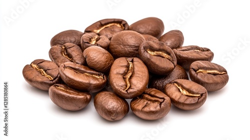 © Krungpol, Naklejka premium Close-up of Aromatic Roasted Coffee Beans: Rich Brown Hues and Intricate Textures Against a Clean White Background