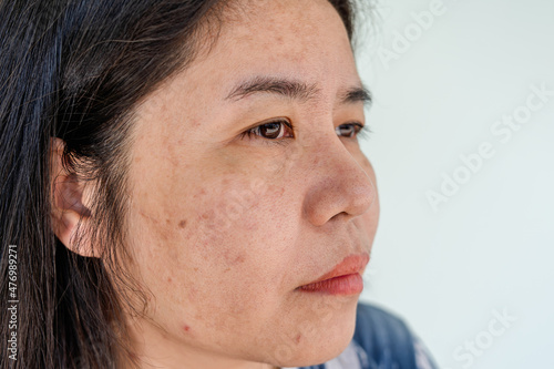 © maemodnit13, Obraz premium Close up of Asian adult woman face has freckles, large pores, blackhead pimple and scars problem from not take care for a long time. Soft focus of skin problem face. Treatment and Skincare concept