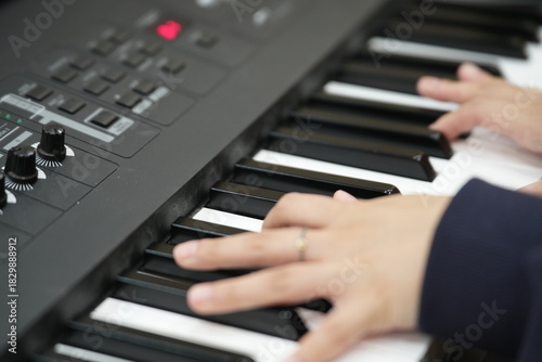 Obraz premium Close-up of Asian hands playing electronic keyboard – music practice and learning