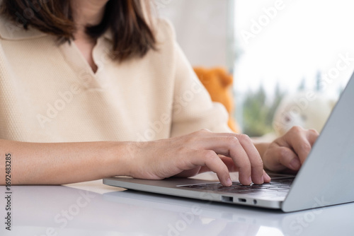 © Bordinthorn, Fototapeta premium Close-up of Asian woman typing on laptop keyboard at home. Concept of remote work, freelancing, online communication, digital workspace, technology usage, or productivity in modern lifestyle.