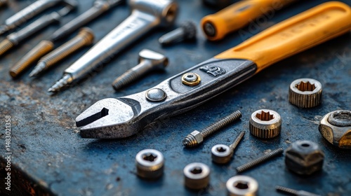 Fototapeta premium Close-up of assorted metal hand tools and fasteners on textured surface