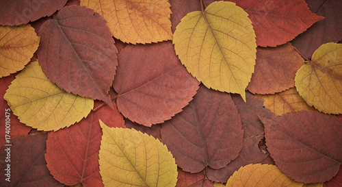© PhotoArtHub, Fototapeta premium Close-up of autumn leaves in yellow, orange, and brown hues, creating a textured natural background, showcasing seasonal beauty and tranquility, ideal for fall-themed designs