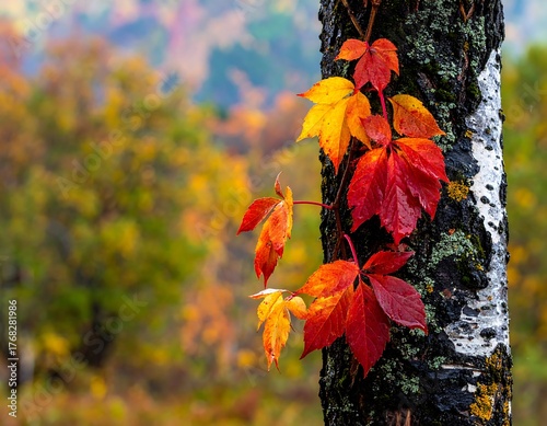 © Doken, Obraz premium Close-up of autumn leaves on tree bark, blurry vibrant backdrop