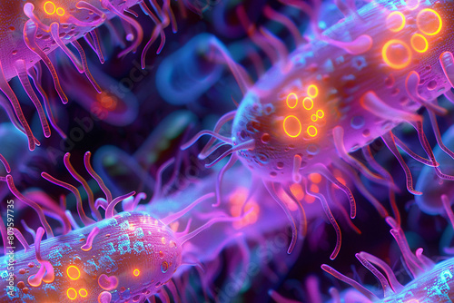 Obraz premium Close-up of bacteria and viruses under microscope, 3d illustration of science...