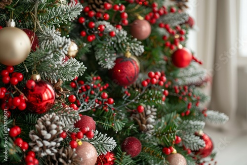 © mehaniq41, Fototapeta premium Close up of balls on christmas tree. Bokeh garlands in the background. New Year concept. Neural network ai generated art