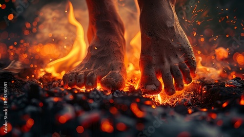© Alpha, Naklejka premium Close-up of bare feet cautiously stepping on burning hot coals, dark background emphasizing the glowing embers and intense heat