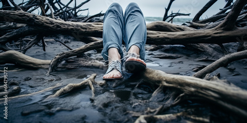 © v.senkiv, Obraz premium Close up of barefoot female feet on the driftwood