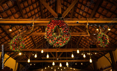 Obraz premium Close up of beautiful Christmas wreaths and balls. Bokeh garlands in the...
