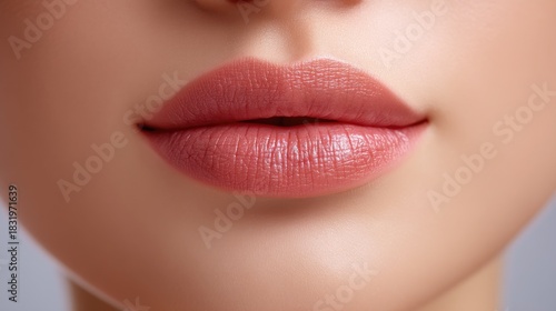 Fototapeta premium Close-Up of Beautiful Lips with Soft Pink Lipstick, Smooth Skin Texture, and...