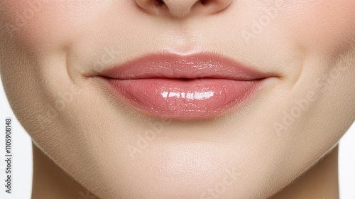 © Sumet, Obraz premium Close-Up of Beautiful Natural Lips with Glossy Finish and Soft Skin, Emphasizing Smooth Texture and Subtle Expression Against Plain Background