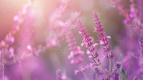 Naklejka premium Close-up of beautiful pink roses blooming in a garden, illuminated by warm sunlight with a dreamy bokeh background...