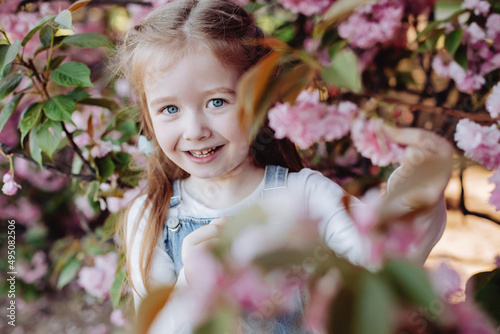 © KIFOR PRODUCTION, Fototapeta premium Close up of beautiful red-haired girl sincerely smiling in the park near sakura.