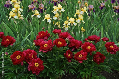 © misu, Obraz premium Close up of beautiful red peonies blooming in a garden with irises.
