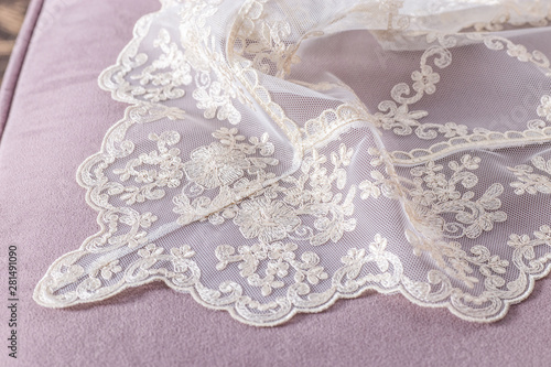Fototapeta premium Close up of Beautiful White Tulle. Sheer Curtains Fabric Sample. Texture,...