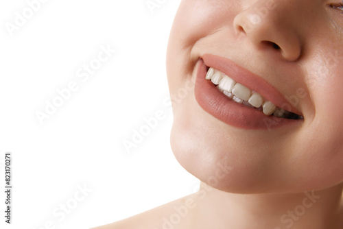 Obraz premium Close up of beautiful wide female smile against white studio background. Oral...