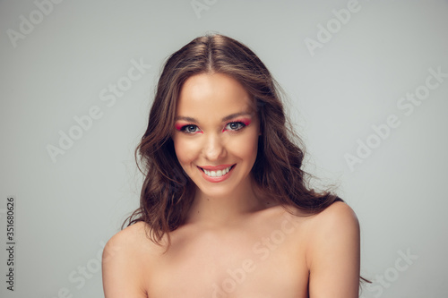 © master1305, Obraz premium Close up of beautiful young woman with long healthy curly hair and bright make up isolated on grey studio backgroud. Beauty and fashion, hair and skin care, treatment concept. Well-kept healthful girl