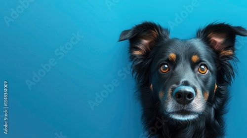 © Dzikrul Husnani, Fototapeta premium Close-up of Black Dog Looking at Viewer on Blue Background