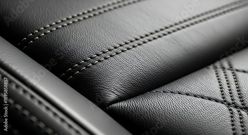 Fototapeta premium Close-up of black leather upholstery with detailed stitching and textured...