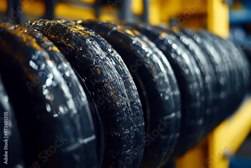 Obraz premium Close-up of Black Rubber Tire Stacked in a Warehouse