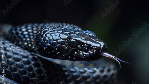 © Viktoriia, Fototapeta premium Close-Up of Black Snake with Glossy Scales and Forked Tongue on black background
