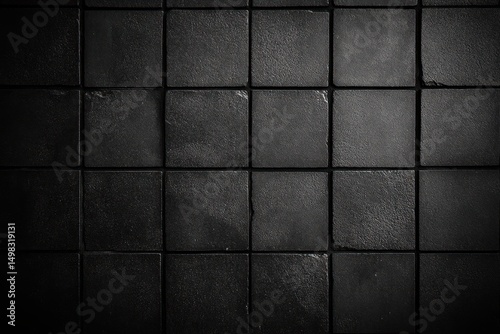 © alu, Naklejka premium Close-up of black square textured tiles arranged in a grid pattern with subtle light reflections and slightly worn edges